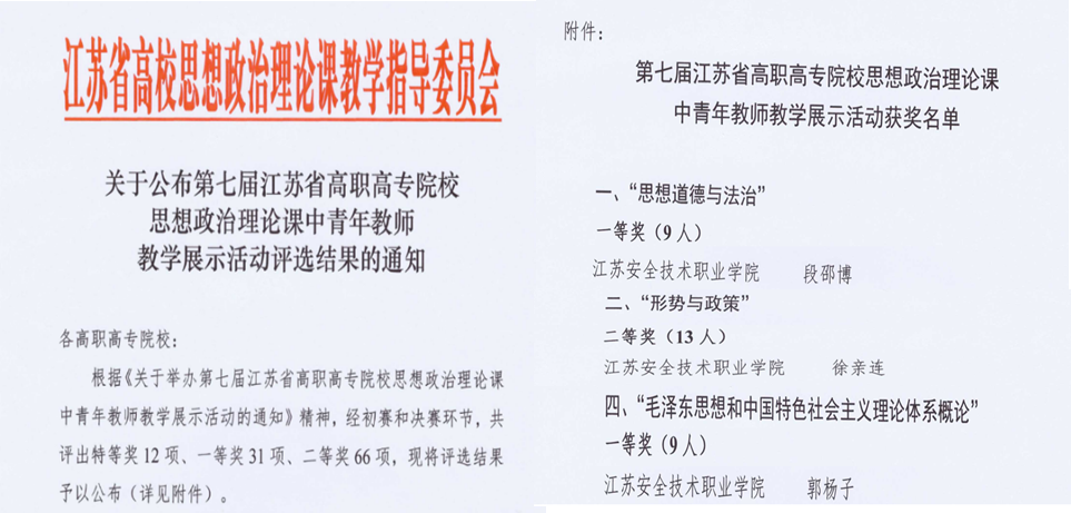 近日,第七届江苏省高职高专院校思想政治理论课中青年教师教学展示活动落下帷幕。马克思主义学院郭杨子老师荣获《毛泽东思想和中国特色社会主义理论体系概论》课程组一等奖,段邵博老师荣获《思想道德与法治》课程组一等奖,徐亲连老师荣获《形势与政策》课程组二等奖。