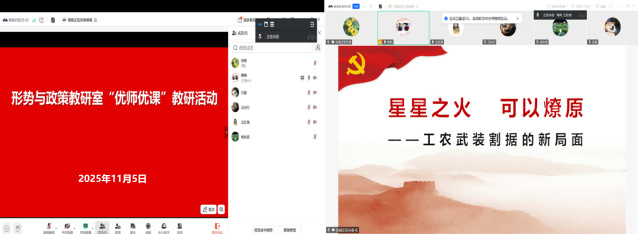 《形势与政策》教研室由张晓老师以“星星之火,可以燎原——工农武装割据的新局面”为题开展思政“金微课”。她以时间线为脉络,融合史料片段、历史场景与理论解读,精准阐释工农武装割据思想形成的历史必然性,生动诠释井冈山精神,并将历史经验与当下国家发展实践相结合,引导学生从革命历史中汲取“勇担时代重任、勇于创新突破”的精神力量,实现历史认知与价值引领的深度融合。讲解结束后,与会教师从教学逻辑、内容深度、育人导向等方面展开评价与讨论,在观点碰撞中凝聚教学共识。最后,张晓老师结合备赛经历,聚焦教学设计分享经验。