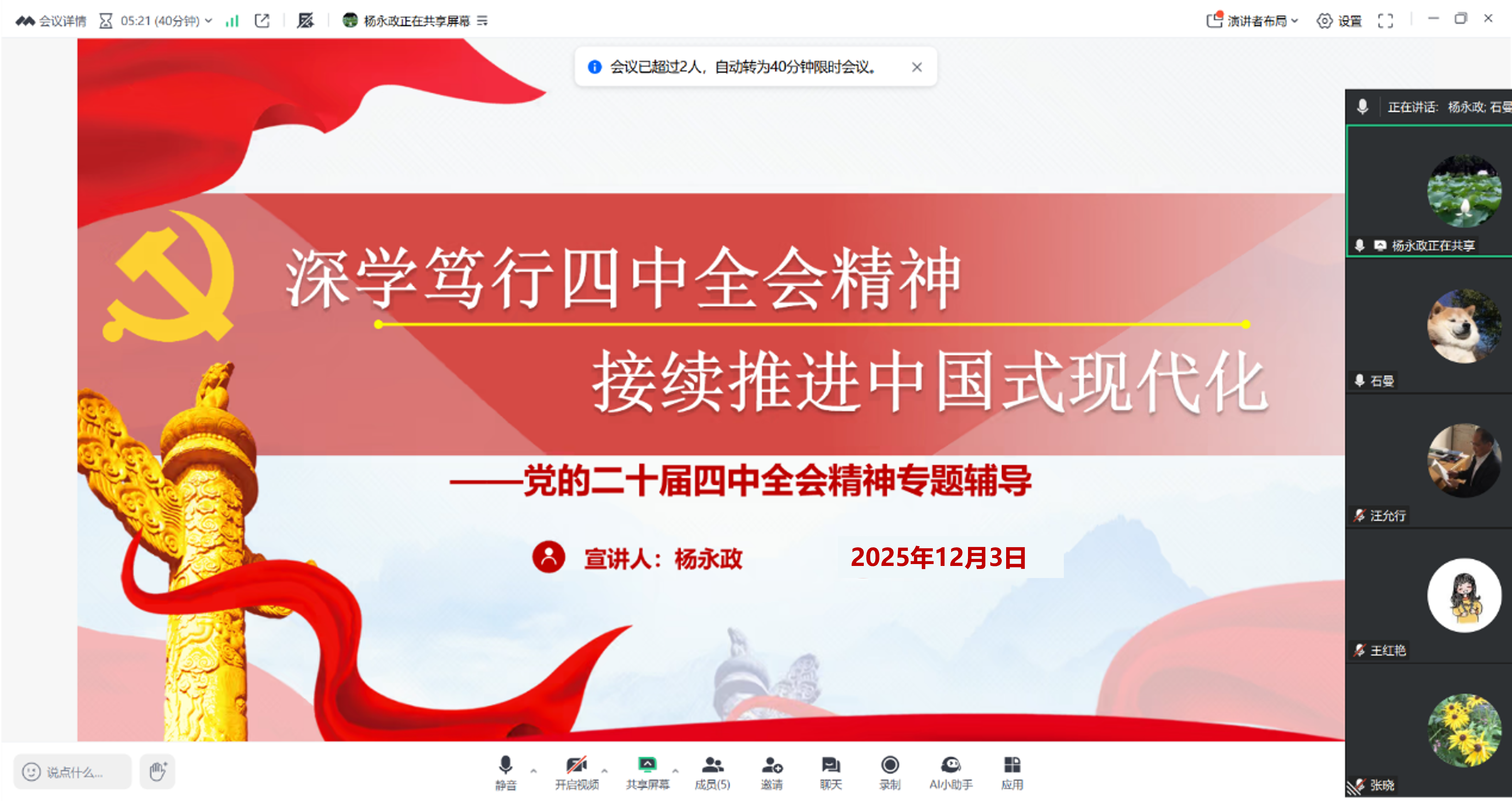 《形势与政策》教研室由杨永政老师以“深学笃行四中全会精神,接续推进中国式现代化”为题,开展党的二十届四中全会精神专题讲解。他从全会召开的时代背景、 “十四五”时期取得的重大成就、“十五五”时期经济社会发展的主要目标方面展开讲解,鼓励教师们立足自身岗位,以脚踏实地的行动、精益求精的态度,将全会精神转化为履职尽责的实际成效,把发展蓝图变为美好现实。随后,教师们聚焦教学设计优化与教学案例分享展开深度交流。大家针对本周教学专题“积极推动两岸交流,坚定不移推进祖国统一大业”从教学目标设定、重难点突破到互动环节设计各抒己见;张晓老师结合自身教学实践,分享了极具参考价值的“客家文化”教学案例,剖析了案例中融入家国情怀教育的巧妙方法。同时,大家就课堂管理中的共性问题交换经验,讨论结课作业评分标准,现场研讨氛围热烈而务实。