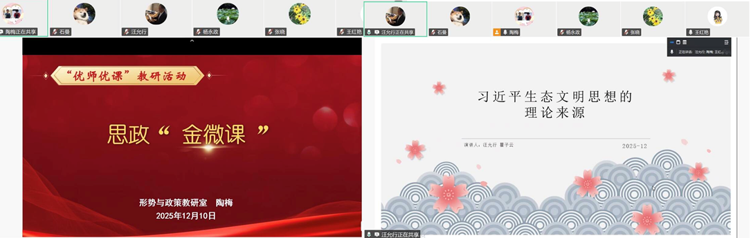 《形势与政策》教研室由陶梅、汪允行两位老师分别就社会主义核心价值观的显著特征、习近平生态文明思想的理论来源进行教学展示,陶梅老师以“体系完整、性质鲜明、底蕴深厚”为核心脉络,阐释社会主义核心价值观立足中国特色社会主义实践又蕴含共产主义精神内核的鲜明特质。汪允行老师溯源而上,系统梳理习近平生态文明思想对马克思主义自然观的继承发展、对中华优秀传统生态文化的传承创新,以及对我国生态文明建设实践经验的理论升华。