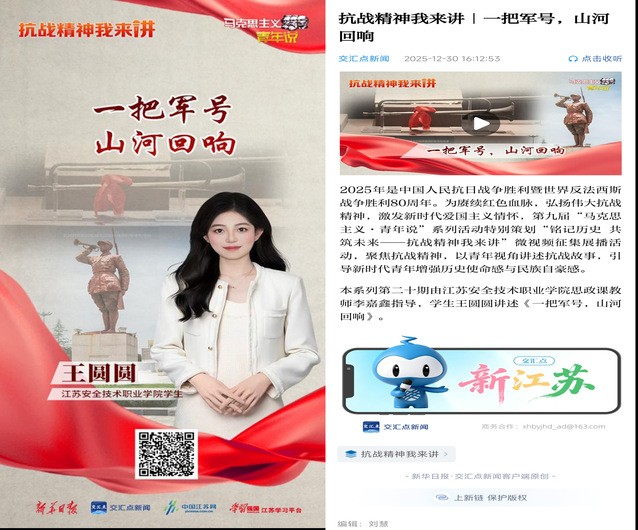 近日,第九届“马克思主义·青年说”系列活动特别策划“铭记历史 共筑未来——抗战精神我来讲”微视频征集展播活动的入选作品于交汇点平台正式展播。我院选送的作品《一把军号,山河回响》从全省两百余部参评作品中脱颖而出,跻身全省20件入围作品之列,此次入围作品包含5所本科院校、9所高职院校及部分社会团体。我院作品的入选,充分彰显了我院在红色文化传播与思政教育创新领域的扎实成效。