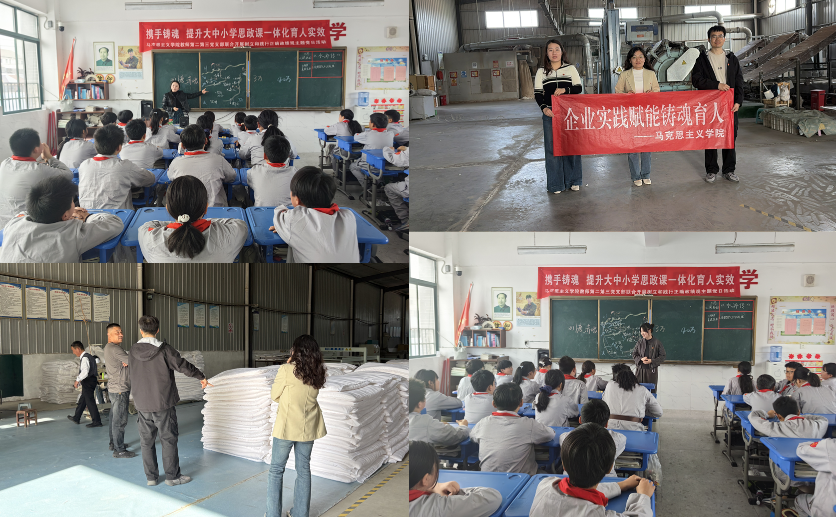 在才庄村,马克思主义学院第一党支部与才庄村党支部开展“党建共建聚合力,共谋乡村新发展”校地党建共建暨乡村振兴座谈会,围绕乡村振兴路径、高校服务地方举措等内容开展交流;在超时红军小学,马克思主义学院第二党支部和第三党支部与该校开展“携手铸魂”思政课教学交流活动。双方聚焦大中小学思政课一体化建设,围绕教学内容优化、教学方法创新、思政实践融合等内容深入研讨;马克思主义学院第四党支部开展基层微调研,围绕粮食安全、乡村教育、思政教育落地实效收集一线素材,为我院党建引领教学科研创新提供坚实支撑。